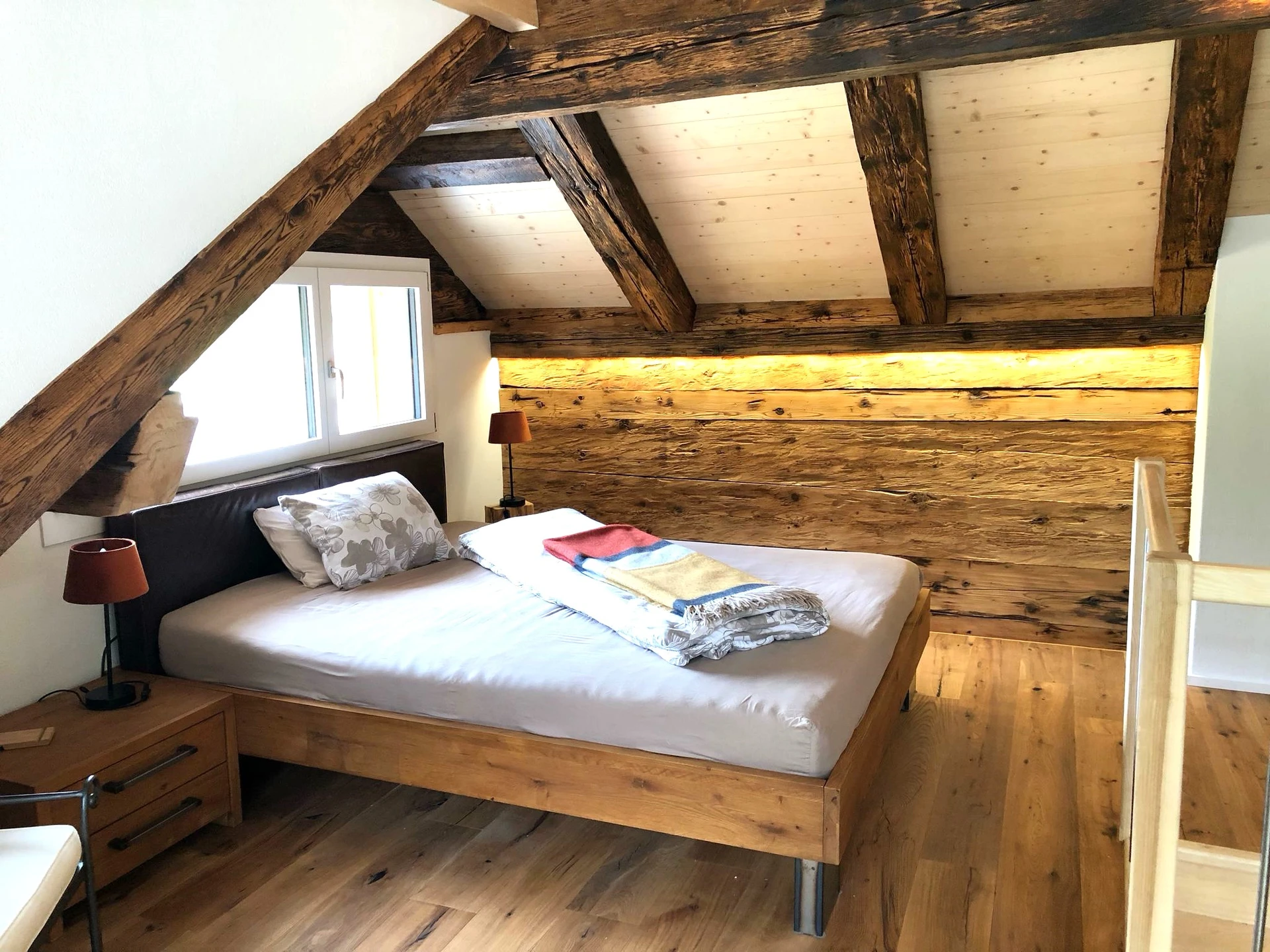 Im oberen Bereich finden Sie einen grosszügigen Schlafbereich mit eigenem WC, Lavabo und Waschmaschine/Trockner ideal für Komfort und Privatsphäre.