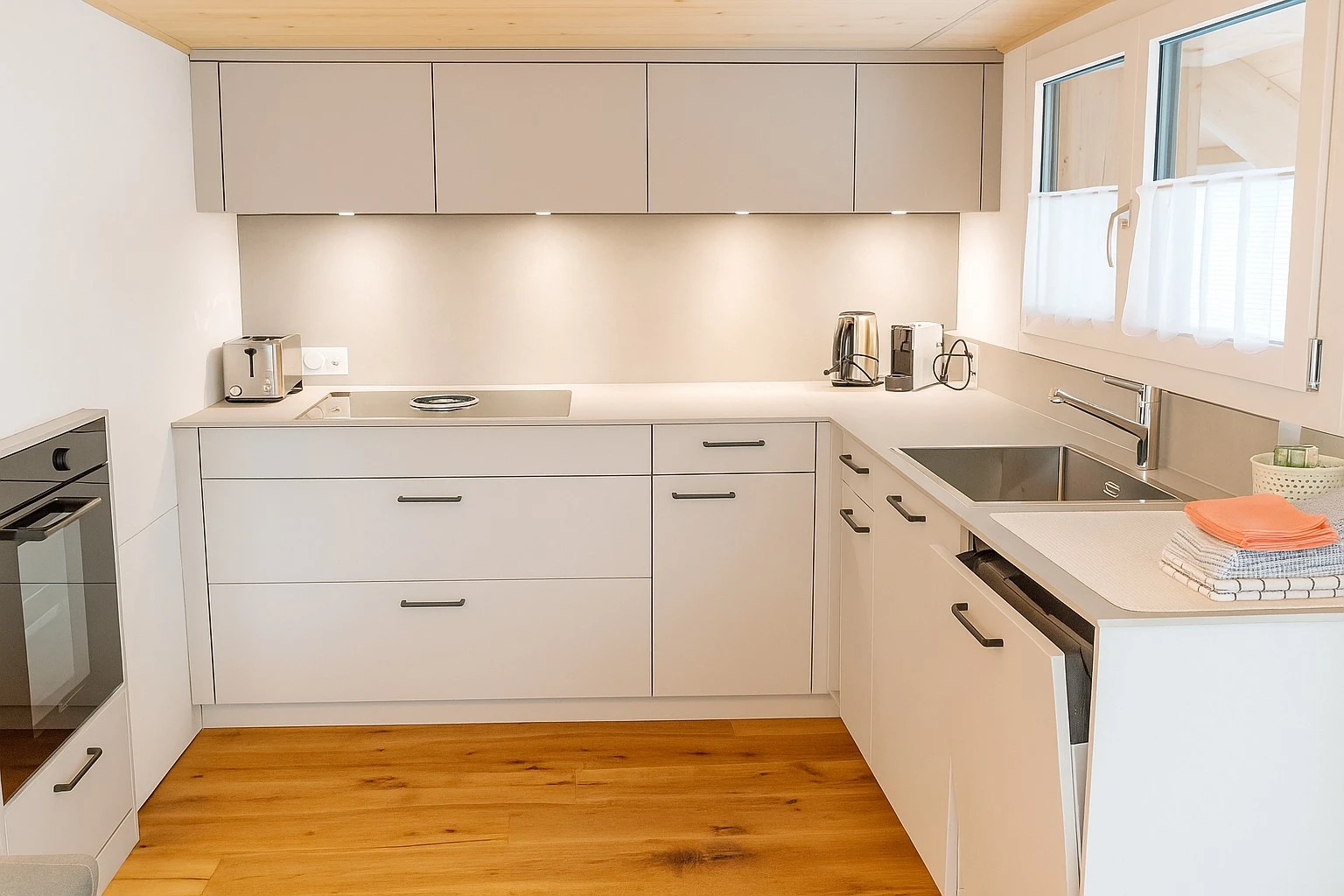 An kalten Winterabenden sorgt der Kamin im Wohnbereich für wohlige Wärme, während draussen der Schnee leise fällt. Im Sommer lassen Sie die Fenster weit geöffnet und geniessen den Duft der Bergwiesen.